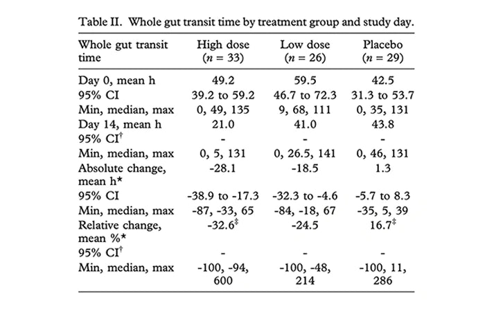 - Transit: Both probiotic doses cut WGTT over 14 days; placebo did not.